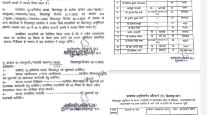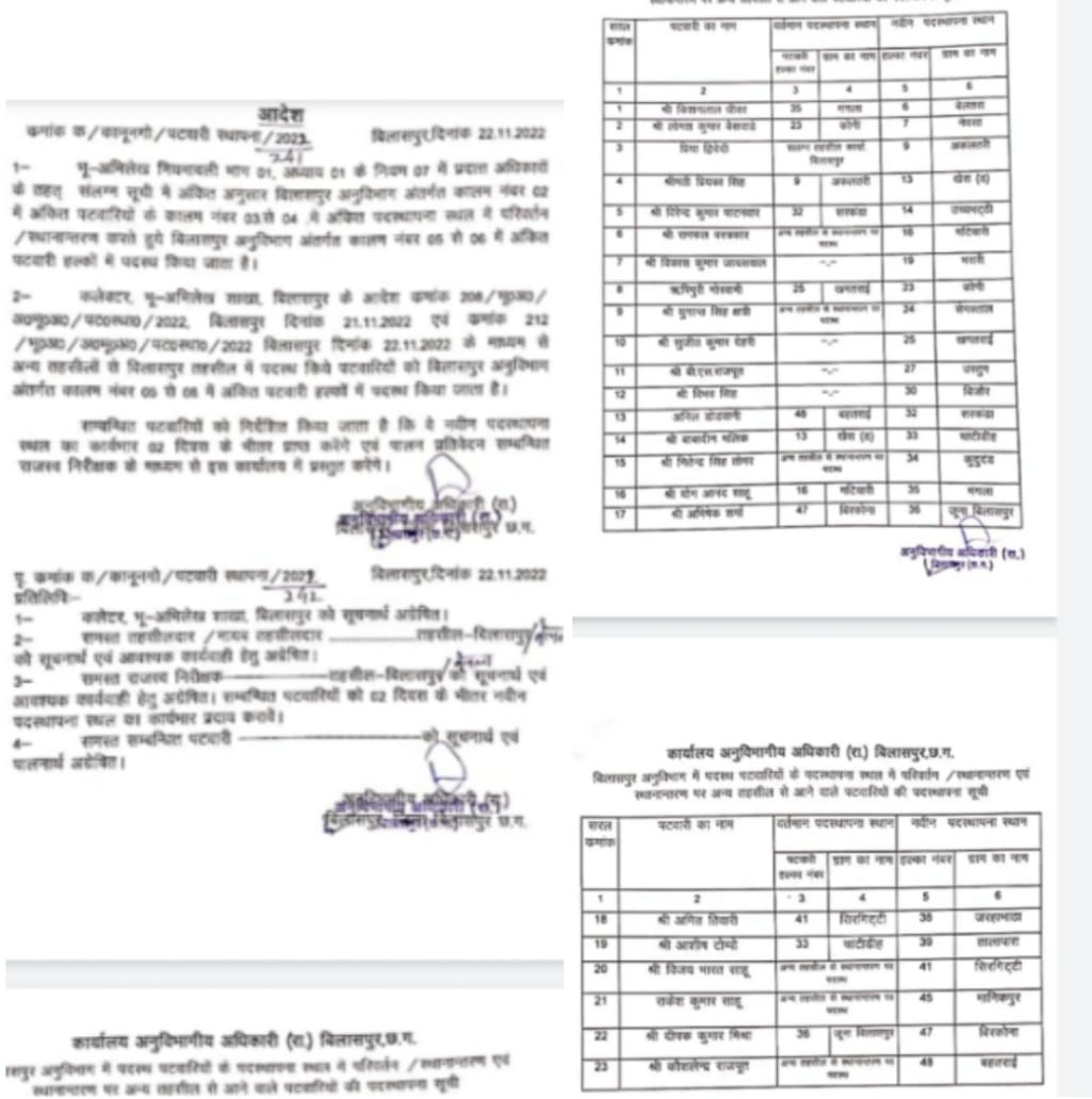 इसी तरह पटवारी दिनेश वर्मा को दस साल हो गए बिलासपुर तहसील में, इधर पटवारी,दीपक मिश्रा,अभिषेक शर्मा ,आशीष टोप्पो, प्रकाश साहू, मनोज खूँटे,अनिल डोडवानी , आलोक तिवारी, प्रीति सिंह को तीन साल से ऊपर एक ही तहसील बिलासपुर में हो चुका है। इन पटवारियों के ख़िलाफ़ सर्वाधिक शिकायतें थी। लेकिन फिर भी ये अंगद की पाँव जैसा जमे हुए है।
