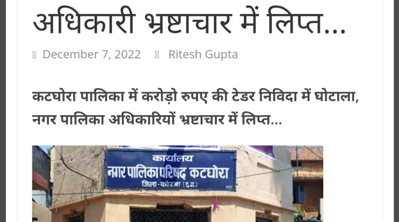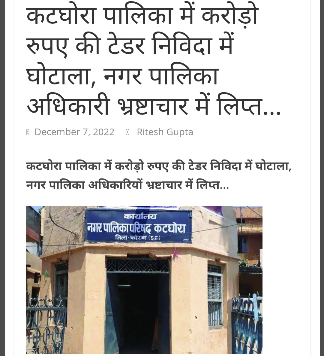 पालिका के अधिकारी भ्रष्टाचार में भ्रष्टाचार में लिप्त थे.. नगरपालिका में हुए इस टेंडर घोटाले की सर्वप्रथम खबर Lallanguru न्यूज में लगाई गई थी जिसके बाद मामले को संज्ञान लेते हुए टेंडर को निरस्त किया है गया है साथ ही नगरीय प्रशासन के प्रमुख सचिव ने कटघोरा टेंडर घोटाले फाइल को तत्काल तलब किया है।