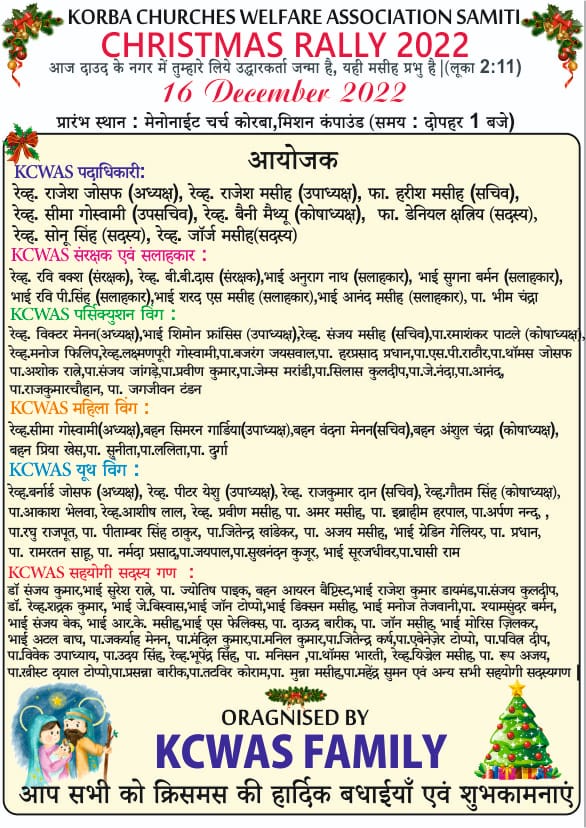 कोरबा। जिले में कोरबा चर्च वेलफेयर एसोसिएशन समिति (KCWAS) के द्वारा 16.12.2022 दोपहर 01:00 को मेनेनाइट चर्च मिशन रोड से सुभाष चौक निहारिका होते हुए घंटाघर तक क्रिसमस मसीही रैली का आयोजन किया गया है। बता दें कि पिछले कई वर्षों के बाद यह रैली निकाली जा रही है। करोना काल के बाद यह पहली भव्य एवं विशाल मसीही रैली होगी, जिसमें बढ़-चढ़कर सभी विश्वासी भाइयों एवं बहनों को सादर आमंत्रित किया गया है। कोरबा जिले के लागभग सभी चर्च इस आयोजन में सम्मिलित होंगे अनुमान लगाया जा रहा है कि आयोजित होने वाली क्रिसमस रैली काफी भव्य एवं विशाल होगी, रैली बाजे – गाजे के साथ धूमधाम से निकाली जाएगी जिसमे झांकी का आयोजन भी किया गया है। KCWAS के अध्यक्ष पास्टर राजेश जोसेफ ने जिले के सभी मसीही भाइयों एवं बहनों को आयोजन में शामिल होने के लिए निवेदन किया है।