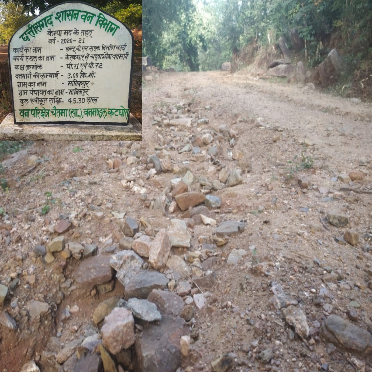 कटघोरा वनमंडल में 45. 30 लाख का डब्ल्यूबीएम सड़क वन अधिकारियों के भ्रष्ट्राचार की चढ़ी भेंट, क्रेशर गिट्टी की बजाय जंगल से खोदकर बिछाया बोल्डर व मिट्टी- मुरुम