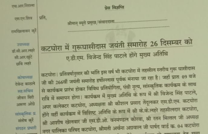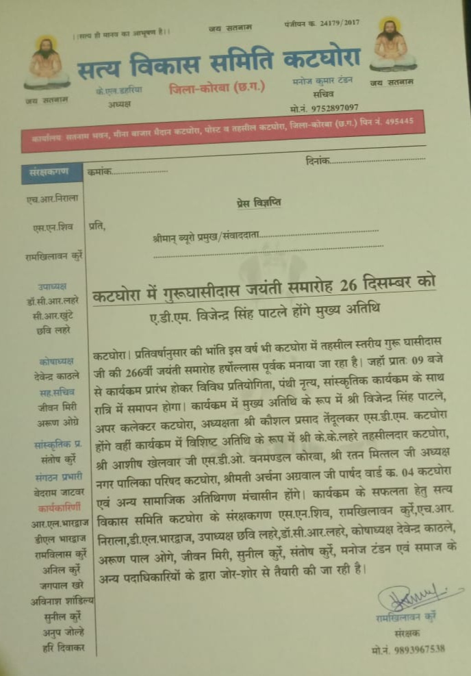 कटघोरा में गुरूघासीदास जयंती समारोह 26 दिसम्बर को होगा आयोजित ए.डी.एम. विजेन्द्र सिंह पाटले होंगे मुख्य अतिथि..