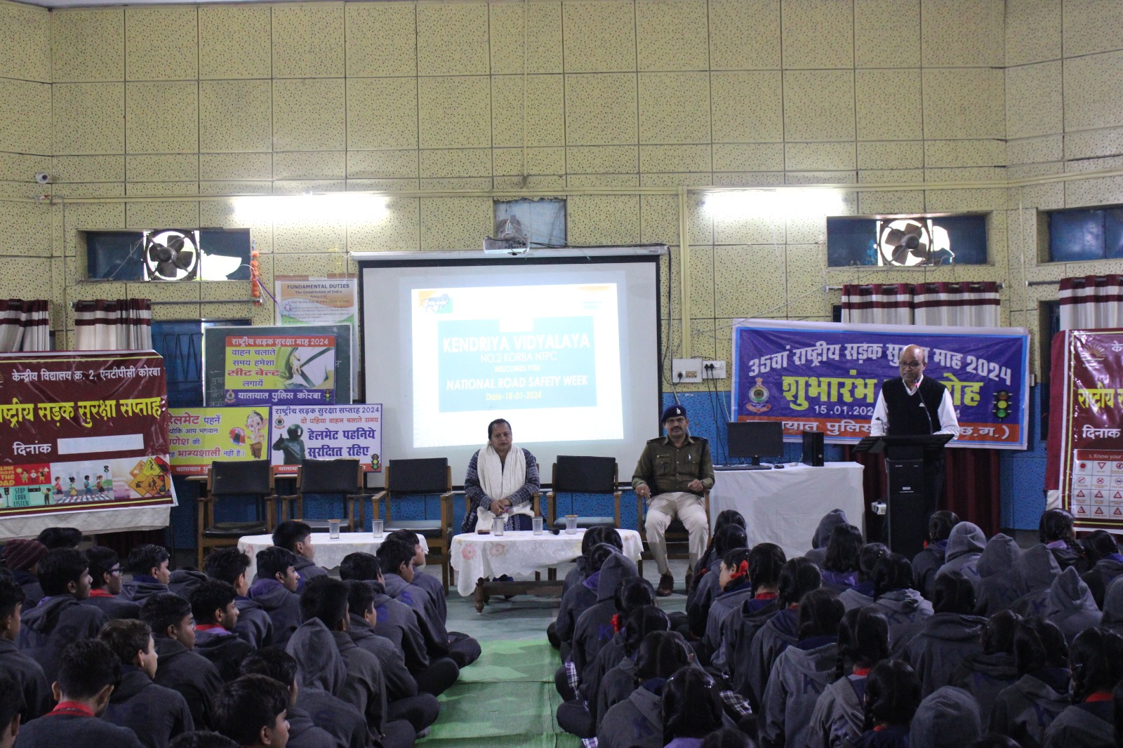 केन्द्रीय विद्यालय क्रमांक 2, एन. टी. पी. सी. में राष्ट्रीय सड़क सुरक्षा सप्ताह का आयोजन प्राचार्य श्री एस के साहू की उपस्थिति में मनाया गया। यातायात विभाग के ए. एस. आई. मनोज राठौर और उनकी टीम ने विद्यालय में उपस्थित होकर विद्यार्थियों एवं कर्मचारियों को जागरूक किया। उन्होंने सड़क सुरक्षा से संबंधित विभिन्न नियमों की जानकारी दी जैसे- 16 वर्ष की उम्र के वे बच्चे ही स्कूटी या बाइक चला सकते हैं, जिनके पास लाइसेंस हो अन्यथा उनके अभिभावकों को 3 महीने की सज़ा का प्रावधान है। साथ ही उन्होंने हेलमेट न पहनने, 2 से ज्यादा सवारी करने, सही जगह पार्किंग न करने, स्पीड ज्यादा रखने, शराब पीकर गाड़ी चलाने आदि से सम्बंधित चालान की जानकारी प्रदान की। विद्यार्थियों को सुरक्षा की दृष्टि से वाहन न चलाने की सलाह देते हुए उन्होंने बताया कि हमारे शहर में भी आये दिन दुर्घटनाएँ सामने आ रहीं हैं, अतः वे सतर्कता बरतें। अंत में विद्यालय प्राचार्य श्री एस के साहू ने श्री मनोज कुमार व उनकी टीम को धन्यवाद ज्ञापित किया तथा सभी को सड़क सुरक्षा नियमों का पूर्णतः पालन करने की सलाह दी। इस दौरान टीम के सदस्य श्री अजय रजवाड़े, श्री रितेश कौशिक, श्री टीकेश्वर साहू, श्री धर्मेन्द्र उपस्थित रहे एवं विद्यालय के सभी शिक्षक व कर्मचारी मौजूद रहे।
