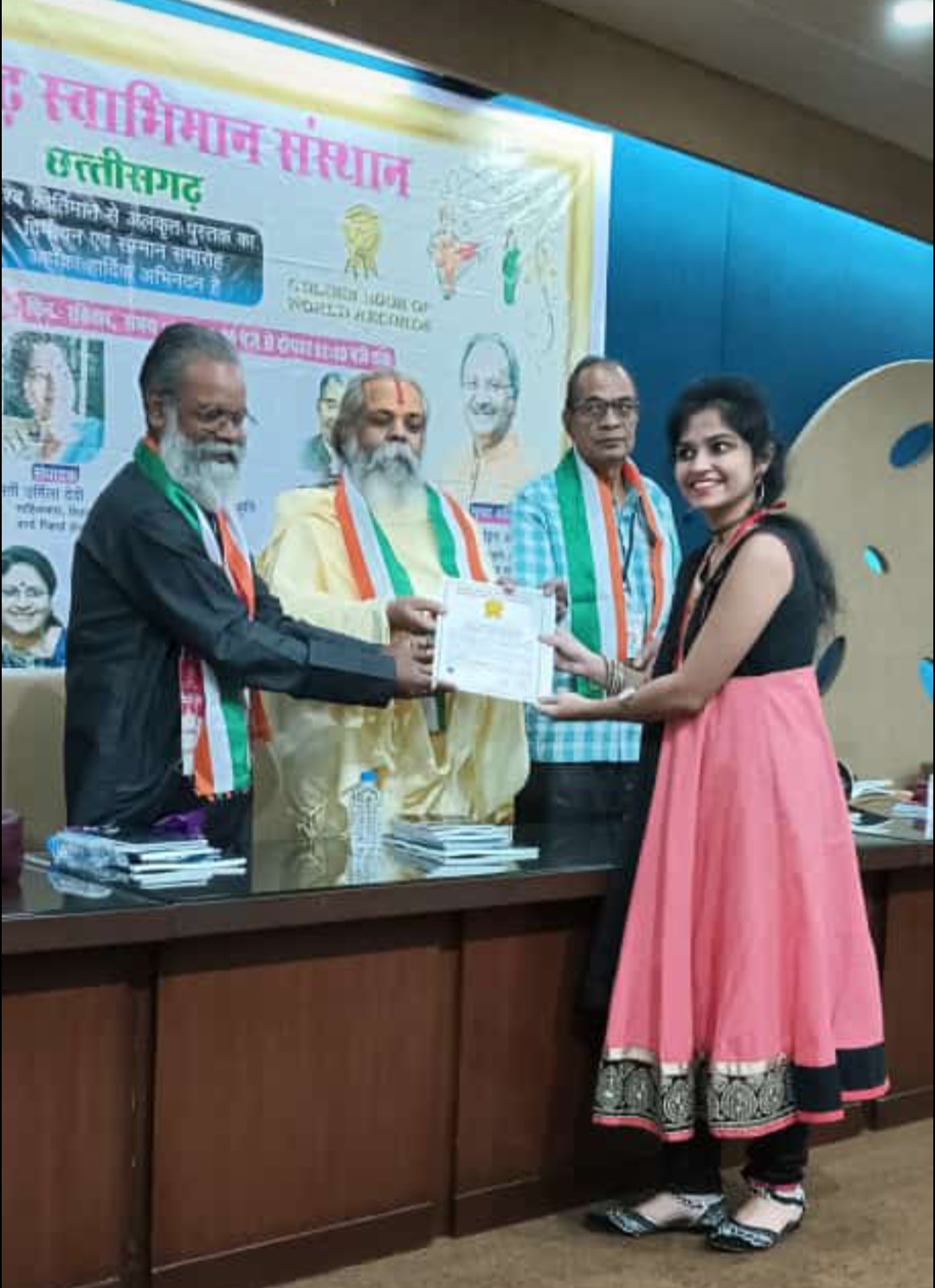 विगत 23 जून को रायपुर के वृंदावन हॉल में छत्तीसगढ़ स्वाभिमान संस्थान के तत्वावधान में सम्मान समारोह एवम् पुस्तक विमोचन का कार्यक्रम हुआ । मुख्य अतिथि माननीय बृजमोहन अग्रवाल (संस्कृति मंत्री ,शिक्षा ,संसदीय कार्यमंत्री छ. ग. शासन) अति विशिष्ट अतिथि , राजेश्री महंत राम सुंदर दास जी महाराज (पीठाधीस्वर श्री दुधाधारी मठ , रायपुर एवम् शिवरीनारायण मठ )विशिष्ट अतिथि डॉ. सुशील त्रिवेदी (पूर्व मुख्य चुनाव आयुक्त , छ. ग. शासन) डॉ. उदयभान सिंह ( अध्यक्ष छ. ग. स्वाभिमान संस्थान, भगीरथ) सोनल शर्मा (गोल्डन बुक ऑफ वर्ल्ड रिकॉर्ड की छ. ग. प्रभारी), शकुंतला तरार , स्नेहलता पाठक, रामेश्वर वर्मा एवम् पुस्तक के संपादक द्वय श्रीमती उर्मिला देवी और डॉ. आशा आजाद (प्रोफेसर, शासकीय महाविद्यालय , कोरबा व कई वर्ल्ड रिकॉर्ड धारी ) आदि की मंच पर उपस्थिति में सभा में उपस्थित देश के कोने-कोने से आए सहभागी रचनाकारों को उपरोक्त पुस्तक में सहभागिता हेतू कुल चार प्रमाणपत्र दिए गए । जो क्रमशः गोल्डन बुक ऑफ वर्ल्ड रिकॉर्ड , संस्कृति विभाग छ. ग. शासन द्वारा राज्य स्तरीय सम्मान , छ. ग. स्वाभिमान संस्थान द्वारा प्रशस्ति पत्र एवम् वैदिक प्रकाशन द्वारा प्रशस्ति पत्र ।