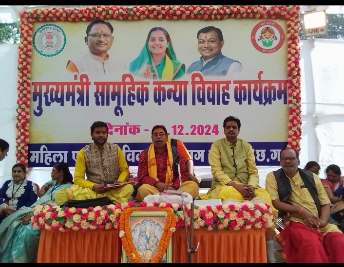 - कोरबा मृगशीर्ष शुक्ल द्वादशी को सीएसईबी खेल मैदान पर आयोजित 102 वर_कन्याओं की जोड़ियों की वैदिक रीति से विवाह पंडित योगेश्वर प्रसाद तिवारी एवम 5 द्विज पंडितो के साथ संपूर्ण विवाह संपन्न कराया गया है, जिसमें माननीय छत्तीसगढ़ सरकार के यशश्वी मुख्यमंत्री श्री “विष्णु देव साय सपत्नीक, उप मुख्यमंत्री अरूण साव जी, उद्योग मंत्री लखन लाल देवांगन , विधायक प्रेम पटेल, जोगेश लाम्बा,अशोक चावलानी, जिलाध्यक्ष डॉक्टर राजीव सिंह, हितानंद अग्रवाल सहित उपस्थित हुए,सभी दूल्हे दुल्हन के जोड़ियों को रुपए 50,000/_का चेक दिया गया है, साथ ही सभी जोड़ियों को विवाह सामग्री, साड़ी,कुर्ता पैजामा के साथ विवाह में आए हुए सभी परिवारों को सीनियर क्लब में प्रशासन की तरफ से भोजन की व्यवस्था की गई।