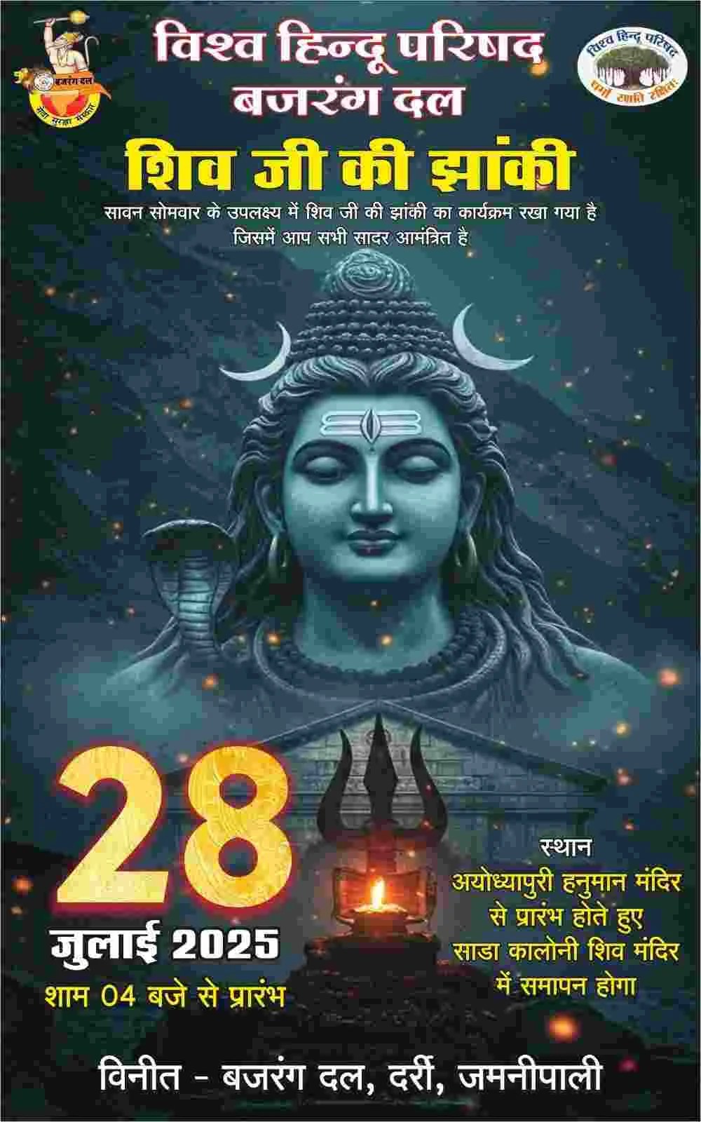 इस सावन सोमवार दर्री-जमनीपाली क्षेत्र में हर हर महादेव के जयकारों से गुंजायमान होगा। भोलानाथ के भक्तों द्वारा शिवजी की भव्य झांकी का आयोजन किया जा रहा है। बजरंग दल दर्री-जमनीपाली के आयोजकत्व में यह कार्यक्रम 28 जुलाई को शाम 4 बजे अयोध्यापुरी हनुमान मंदिर से प्रारंभ होगा, जिसमें क्षेत्र के श्रद्धालु बड़ी संख्या में सम्मिलित होंगे।
