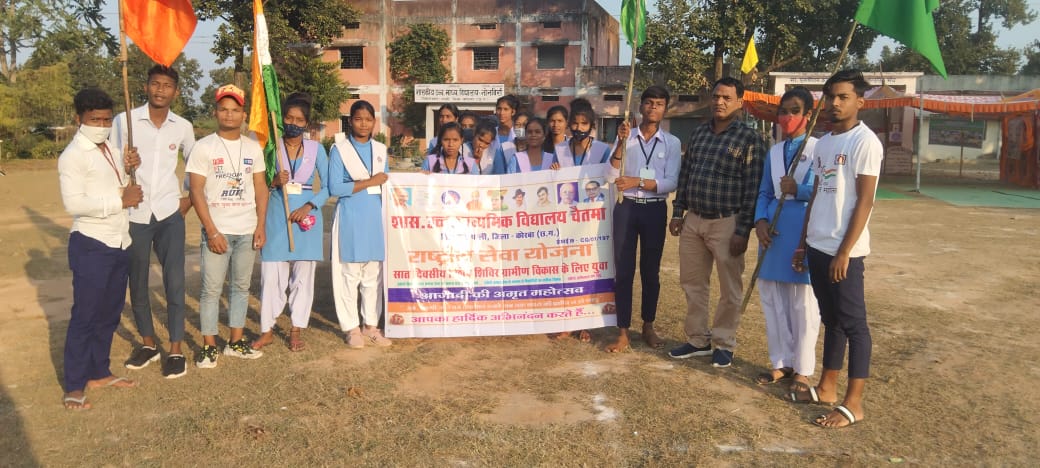Korba: शासकीय उच्च माध्यमिक विद्यालय चैतमा अटल बिहारी वाजपेयी विश्विद्यालय बिलासपुर समन्वयक डॉ मनोज सिन्हा ,जिला संगठक प्रो वाय के तिवारी,प्राचार्य संरक्षक एच आर निराला जी के निर्देश पर कार्यक्रम अधिकारी शिविर सयोजक वीरेंद्र कुमार बंजारे के मार्गदर्शन पर प्रातः योग अभ्यास, पीटी, पिरामिड एवं स्वयं सेवकों ने श्रमदान करते हुए गांव गली में स्वच्छता अभियान, प्लास्टिक मुक्त अभियान, कीचड़ युक्त हैंड पम्प के पास सफाई एवं आने जाने के लिए मिट्टी ईटा से से रोड बनाते हुए।